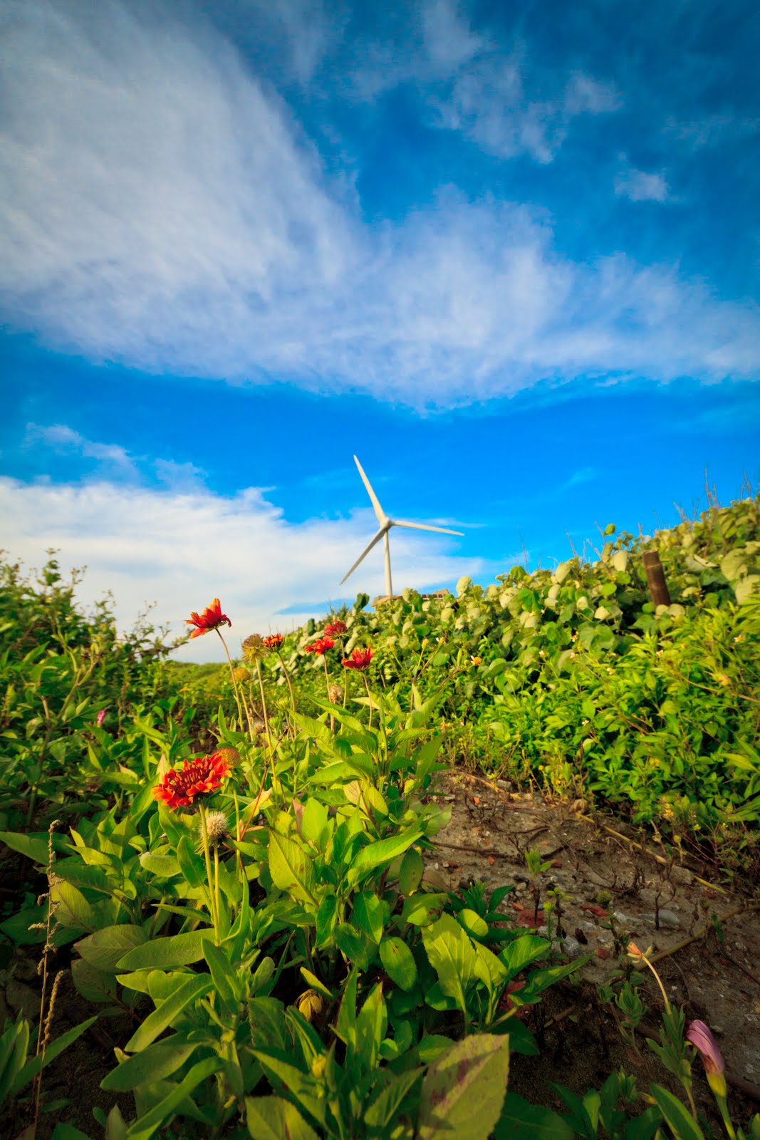 這張我腳都快起水泡,今天是台灣第三高溫記錄,整整38度高溫,但是我還是要拍照得啦,這一張故意以很低的角度,用廣角得視角帶上後製得暗角,來吐顯紅花與風車對比