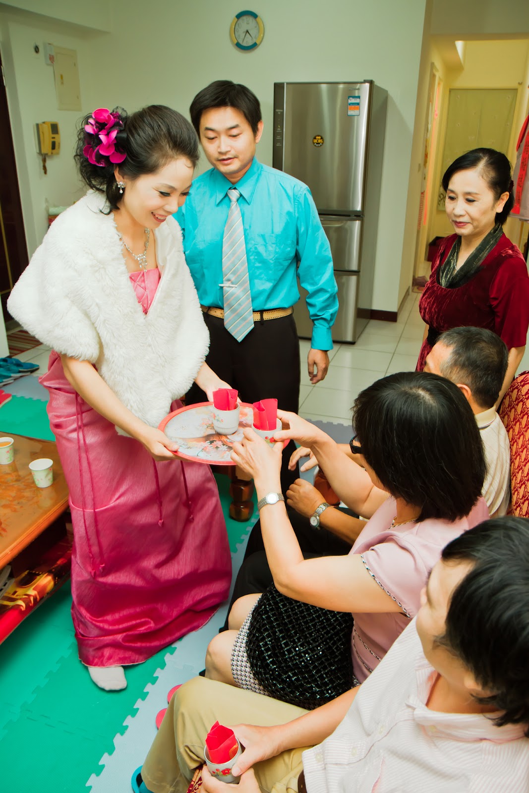這一次最大任務就是拍團體照,這是岳父很看中這一次任務,哇壓力很大喔,所以這一次出動了兩隻閃燈跟閃燈架,為什麼要出動兩隻閃燈?因為在室內團體照時候,如果只有一隻閃燈,加上人數很多的話可以會拍白臉跟黑臉,因為跳燈光線不過均勻關係,所以我把畢生第一次大型團體照獻給這一次也是第一次離機閃燈拍攝。我的拍攝方式是左右各一隻中間,光圈大概設定在F11吧,拍團體照一定要縮光圈,不然前排清楚後排模糊,就這樣拍了大概四張吧。中間我還搞笑演出,西瓜甜不甜、新娘帥不帥又被小P唸了,因為『新娘帥不帥』,博君一笑吧。